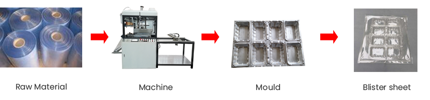 Automatic material feeding→Heating→Vacuum forming→Sheet Clamping and pull -out by manipulator→ Sheet cutting and stacking.